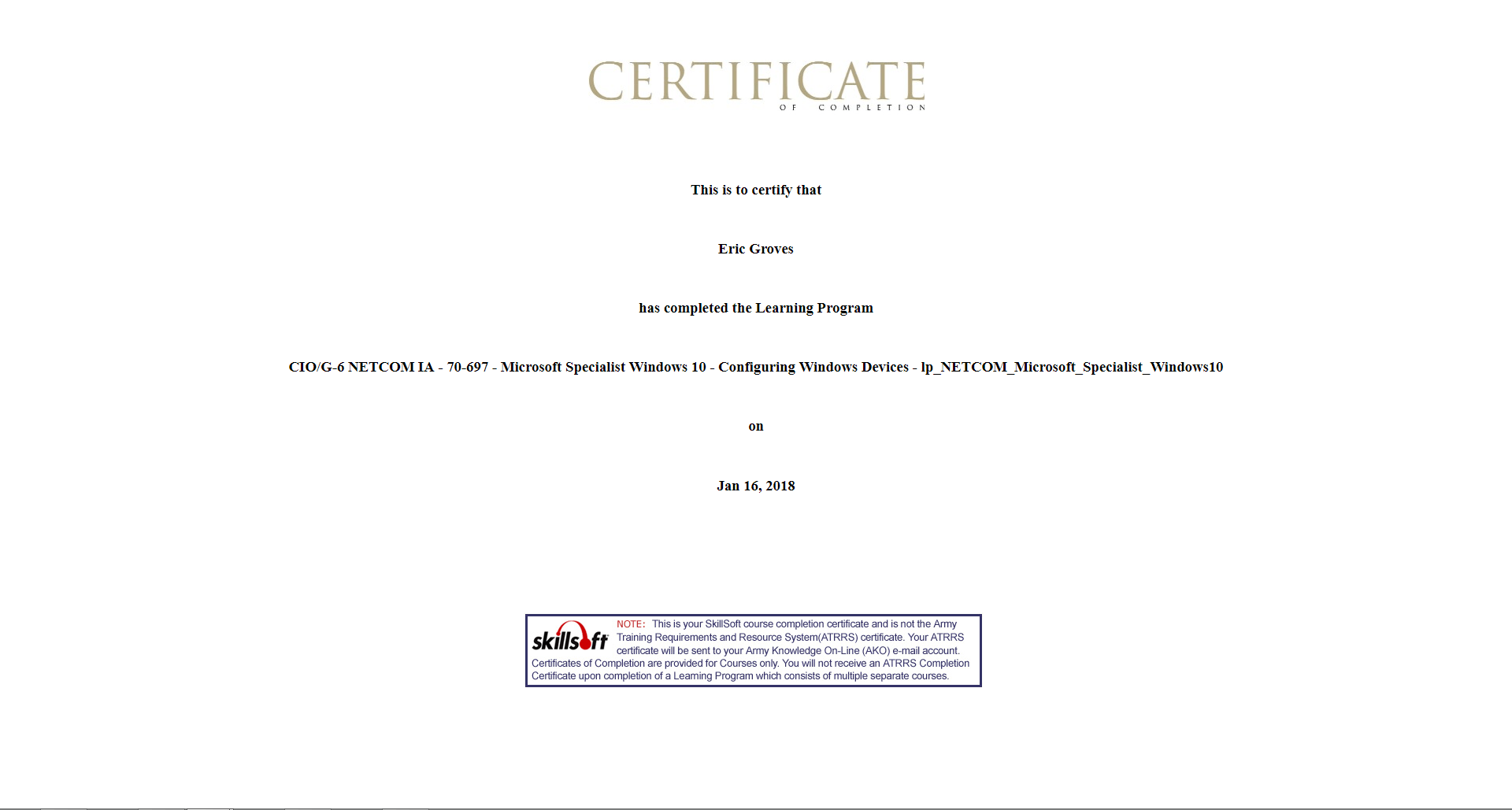 My first major steps into the IT industry were as a Help Desk Analyst. Here I helped support a nationwide enterprise network and was the first line in troubleshooting and resolving problems. I would receive trouble tickets by phone and email for a wide arrange of issues including hardware issues, software issues, web application issues, software requests, account changes, password resets, equipment moves, and infrastructure change requests. Below are some of the training certificates of training I completed for Windows 10 administration.